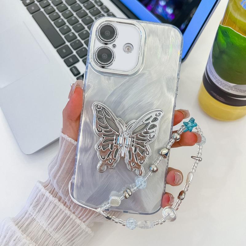 For iPhone 16 Plating Glitter Lens Film Texture Butterfly Holder Wristband Phone Case(White Feather Yarn)