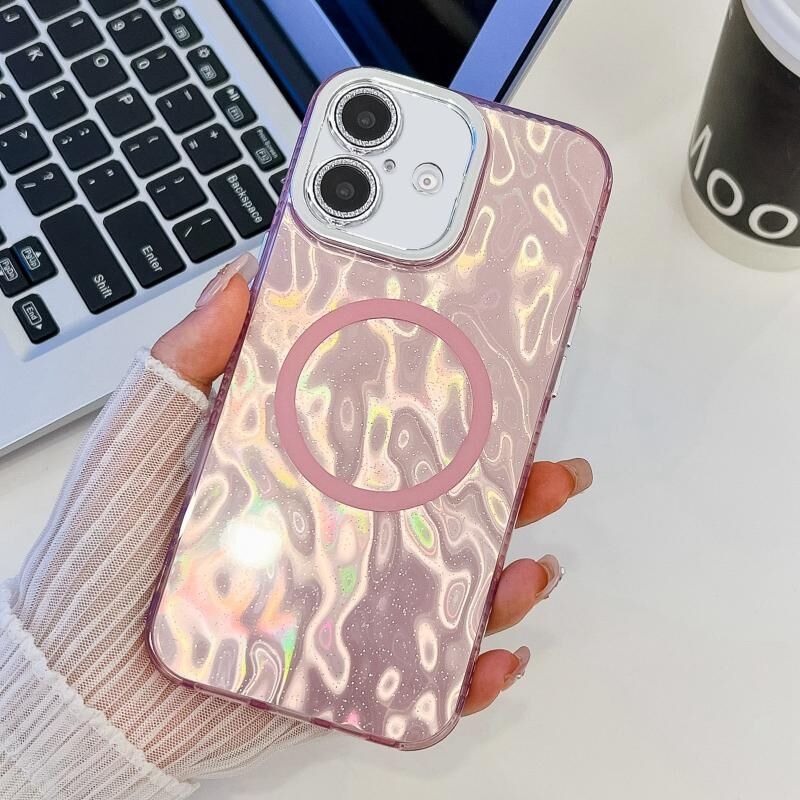 Θήκη τηλεφώνου TPU με επιμετάλλωση, υφή και MagSafe για iPhone 16 με προστατευτική μεμβράνη φακού με γκλίτερ (Λευκά Κύματα Νερού)