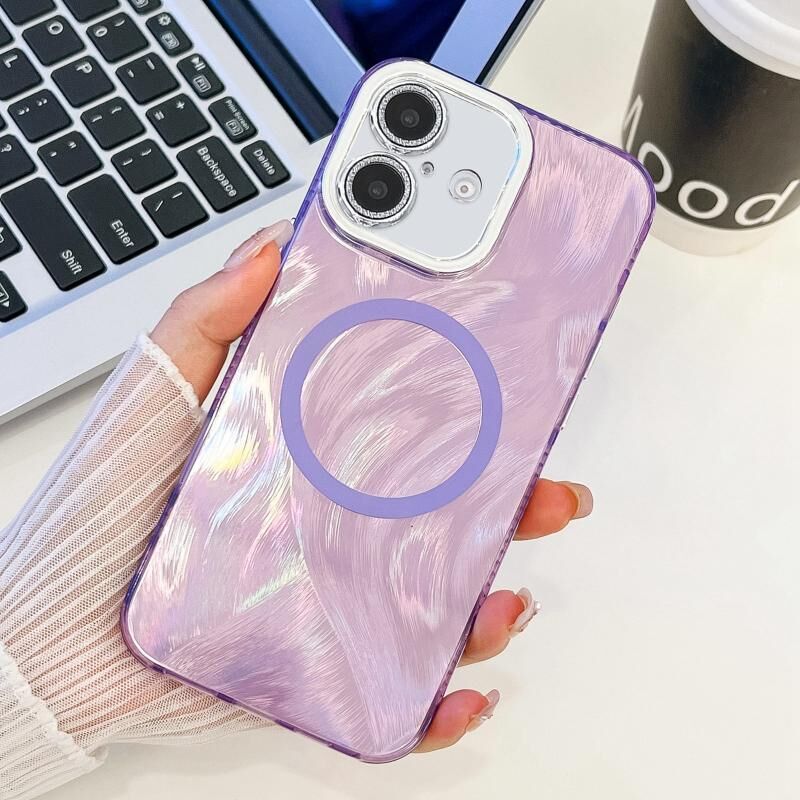 Θήκη τηλεφώνου TPU με επιμετάλλωση, υφή και MagSafe για iPhone 16 με προστατευτική μεμβράνη φακού με γκλίτερ (Λευκά Κύματα Νερού)