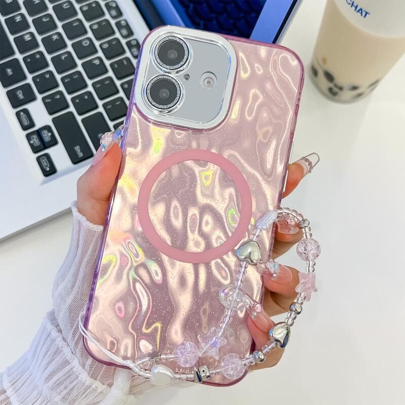 Θήκη τηλεφώνου MagSafe TPU με επιμετάλλωση, υφή καρπού και προστατευτική μεμβράνη φακού με γκλίτερ για iPhone 16 (Λευκά Κύματα Νερού)