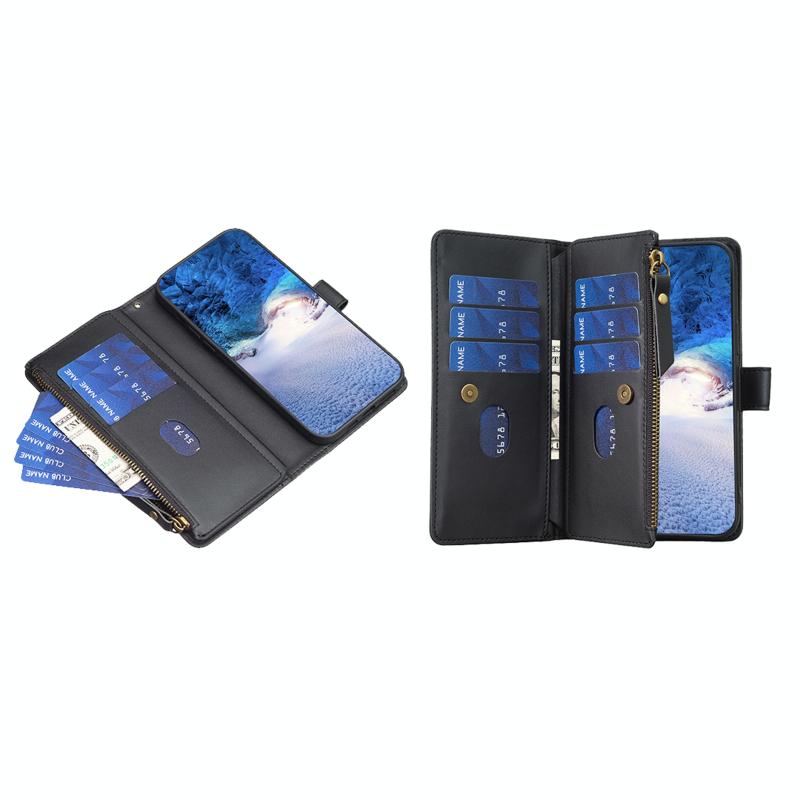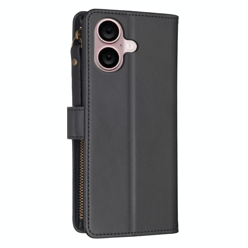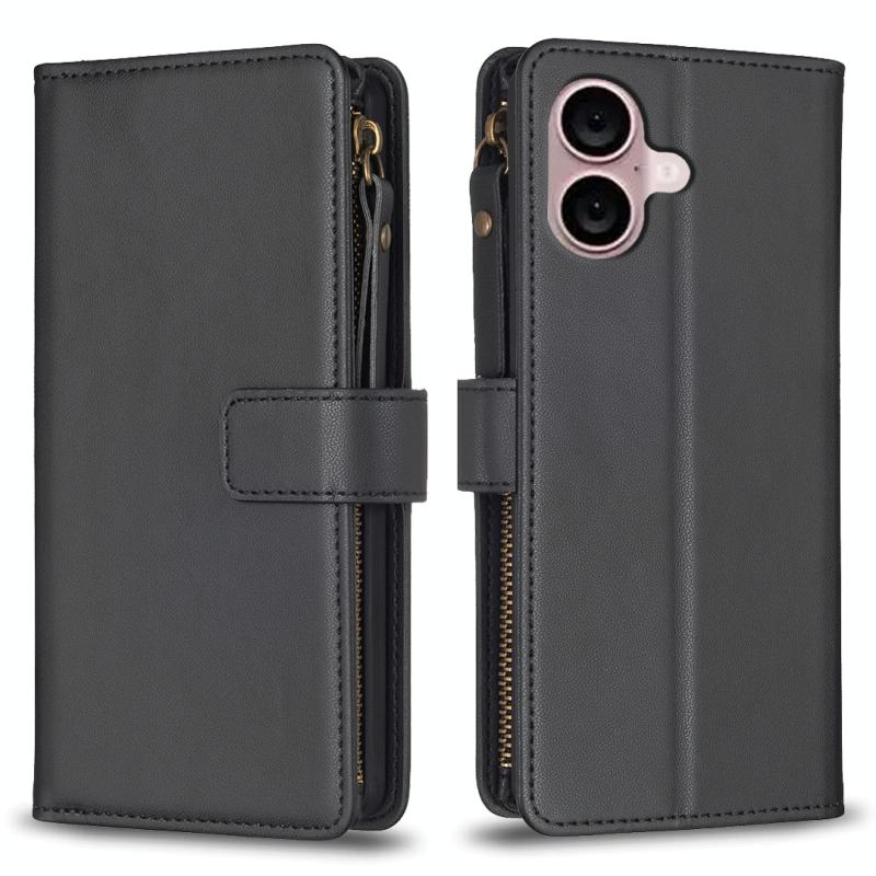 Θήκη τηλεφώνου τύπου flip από δέρμα με φερμουάρ και 9 θήκες για κάρτες για iPhone 16 Plus (Μαύρο)