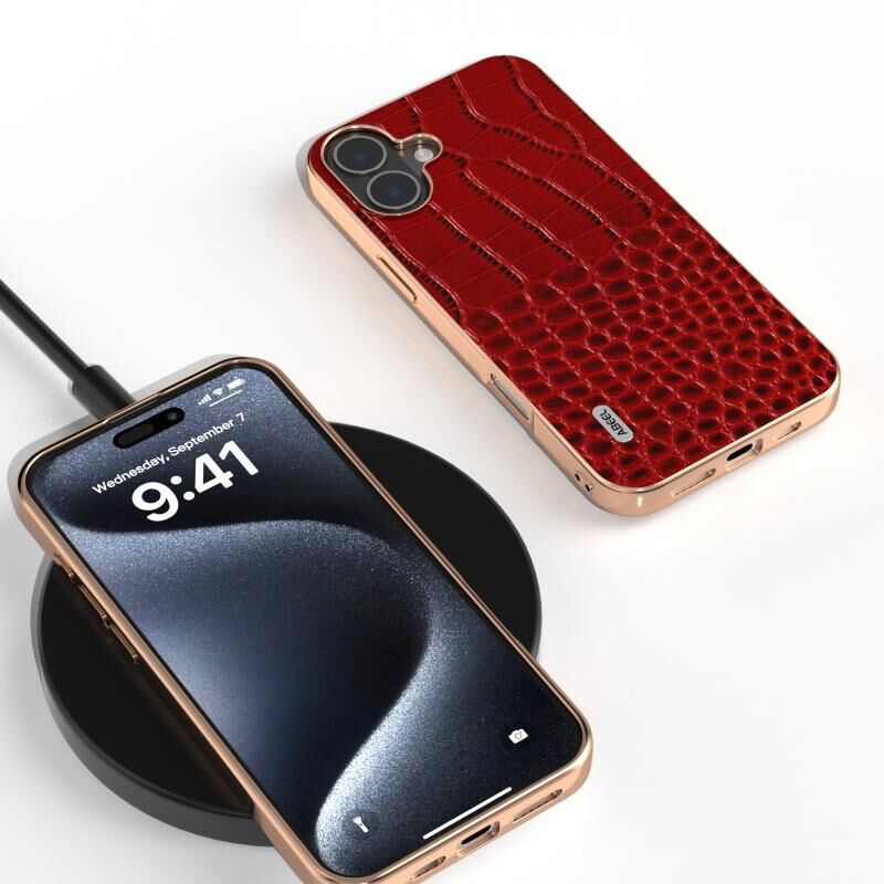 Θήκη τηλεφώνου για iPhone 16 Plus ABEEL με ηλεκτρολυτικό πλαίσιο και γνήσιο δέρμα με μοτίβο κροκόδειλου (Κόκκινο)