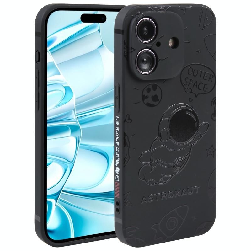 Θήκη τηλεφώνου για iPhone 16 Plus με σχέδιο αστροναύτη, σιλικόνης, ευθείων άκρων (Αστροναύτης σε πτήση - Μαύρο)
