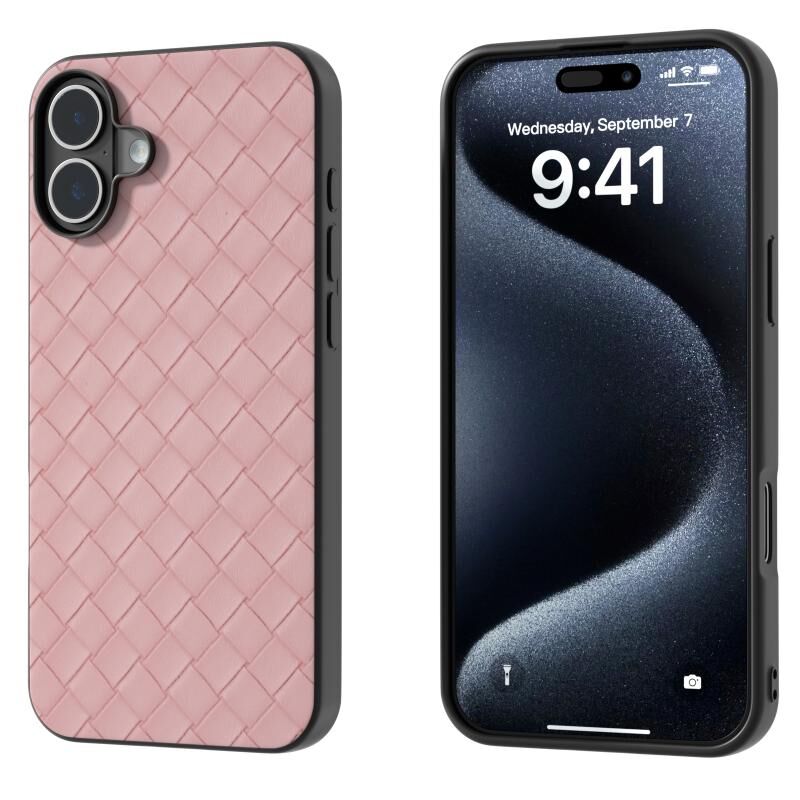 Θήκη τηλεφώνου για iPhone 16 Plus Μαύρο πλαίσιο, Υφή υφαντού PU (ρόζ)