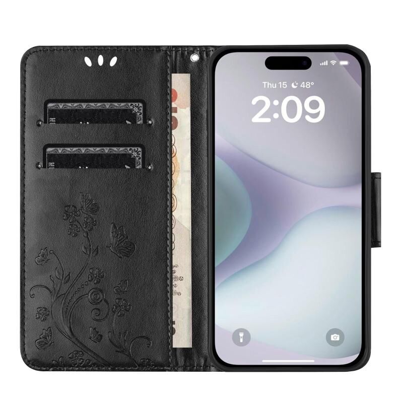For iPhone 16 Plus Butterfly Flower Pattern Flip Leather Phone Case(Black)