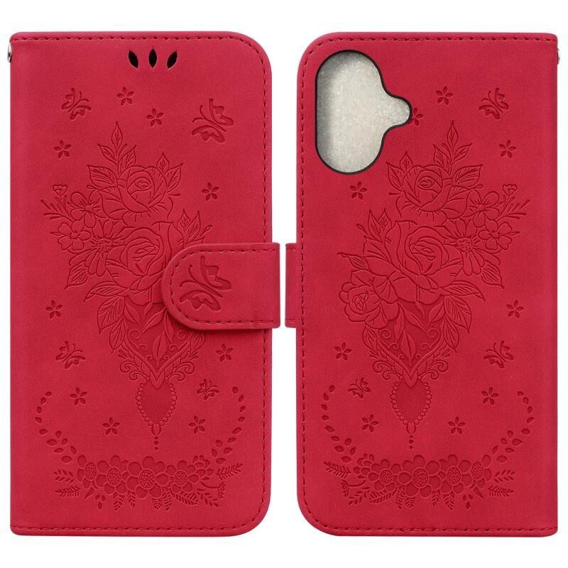 Θήκη τηλεφώνου από δέρμα με ανάγλυφο σχέδιο πεταλούδας και τριαντάφυλλου για iPhone 16 Plus (Κόκκινο)