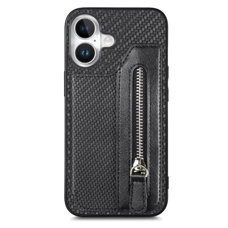 Για το iPhone 16 Plus Carbon Fiber οριζόντια Flip φερμουάρ πορτοφόλι τηλέφωνο υπόθεση (Μαύρο)