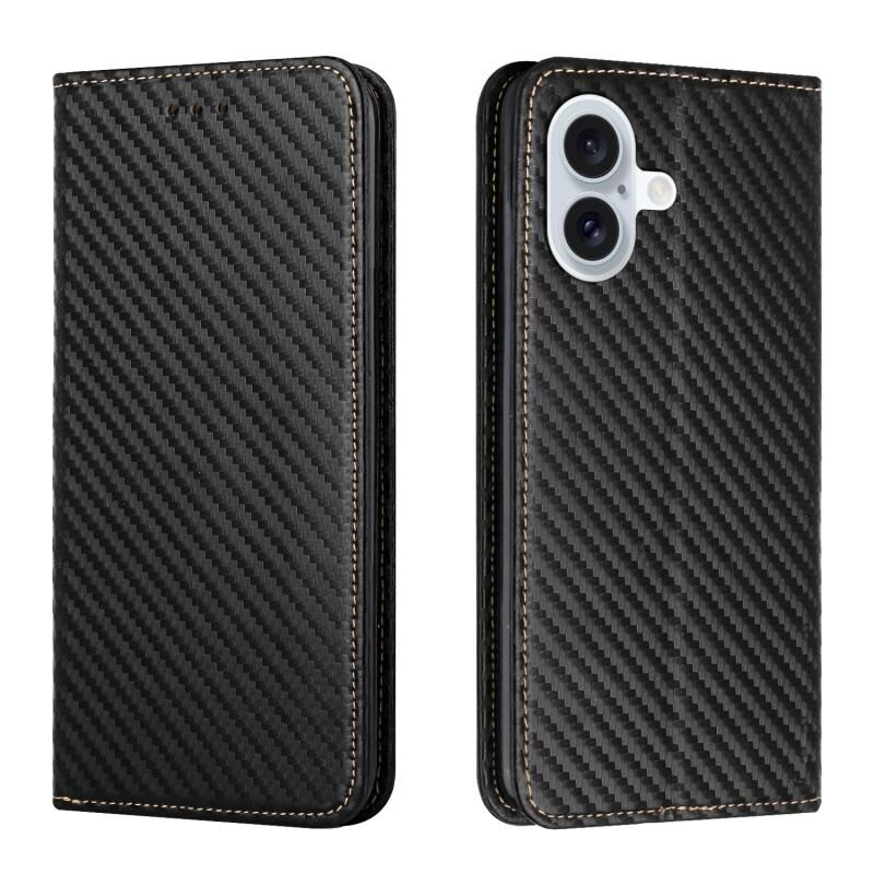 For iPhone 16 Plus Carbon Fiber Texture Magnetic Flip Leather Phone Case(Black)