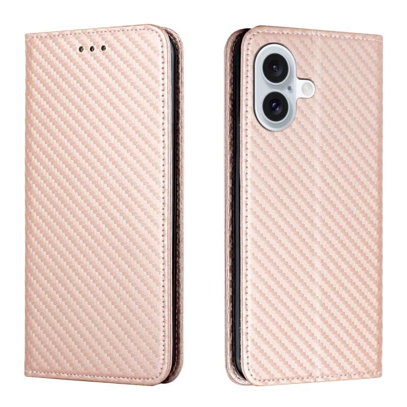 For iPhone 16 Plus Carbon Fiber Texture Magnetic Flip Leather Phone Case(Rose Gold)