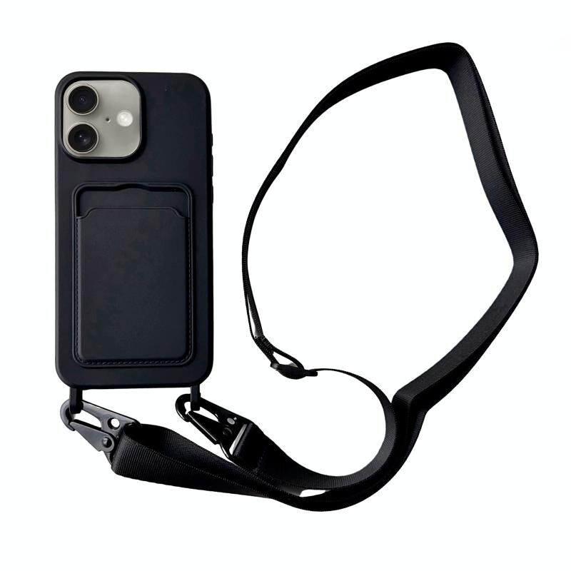 Θήκη σιλικόνης υγρού για iPhone 16 Plus με υποδοχή κάρτας και κορδόνι (Μαύρο)