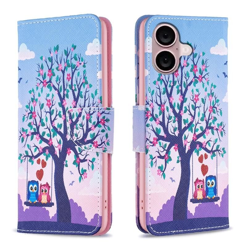 Θήκη τηλεφώνου από δέρμα με σχέδιο πολύχρωμης ζωγραφικής και πτυσσόμενο μηχανισμό για iPhone 16 Plus (Κουκουβάγια)