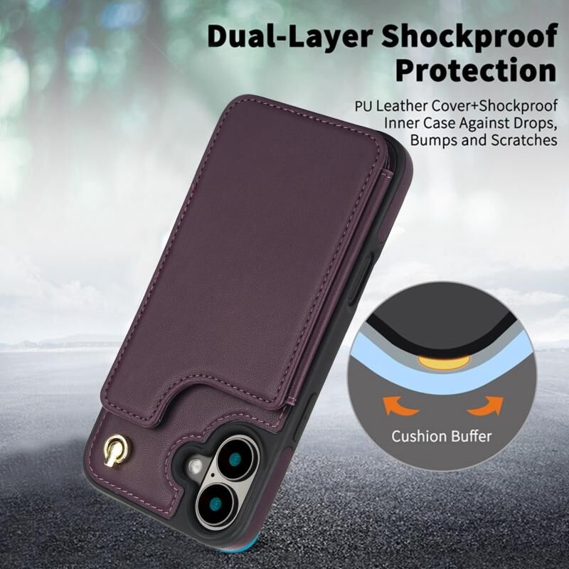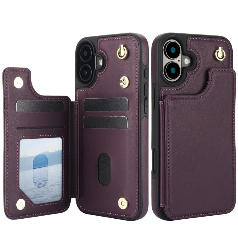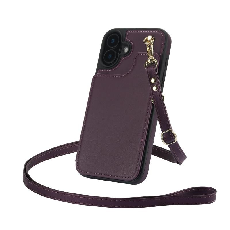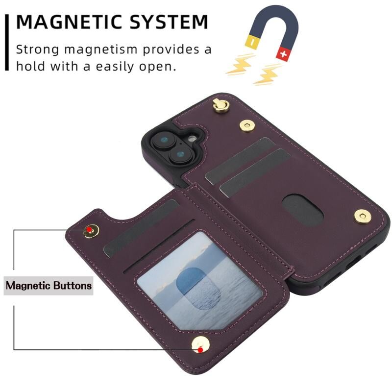 Θήκη τηλεφώνου από δέρμα για iPhone 16 Plus, διαγώνια με διπλή αγκράφα (Σκούρο μωβ)