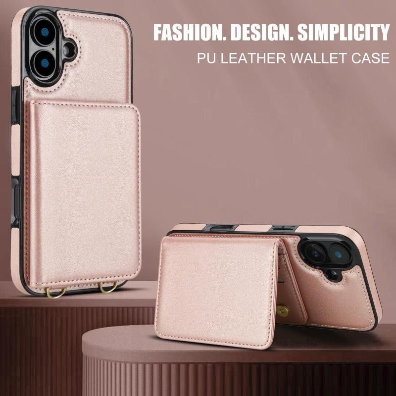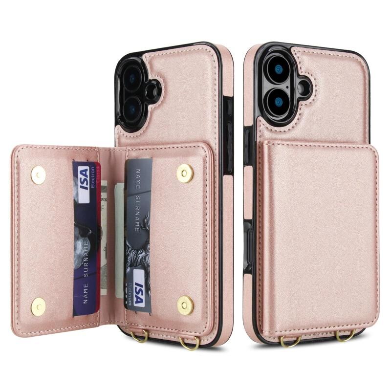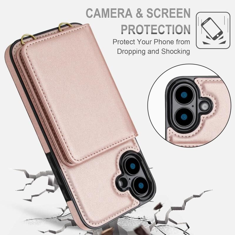 For iPhone 16 Plus Crossbody Dual-buckle Wallet RFID Back Leather Phone Case(Rose Gold)