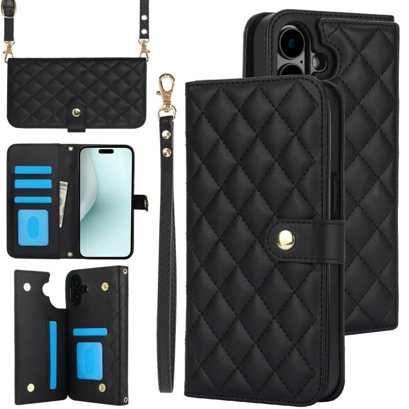 Θήκη τηλεφώνου για iPhone 16 Plus, πολυλειτουργική, δερμάτινη με ρόμβους, σε σχήμα crossbody (Μαύρο)