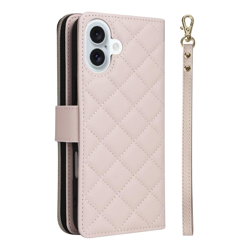 For iPhone 16 Plus Crossbody Rhombic Zipper Tower Buckle Leather Phone Case with Lanyard(Beige)