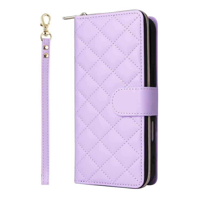 For iPhone 16 Plus Crossbody Rhombic Zipper Tower Buckle Leather Phone Case with Lanyard(Purple)