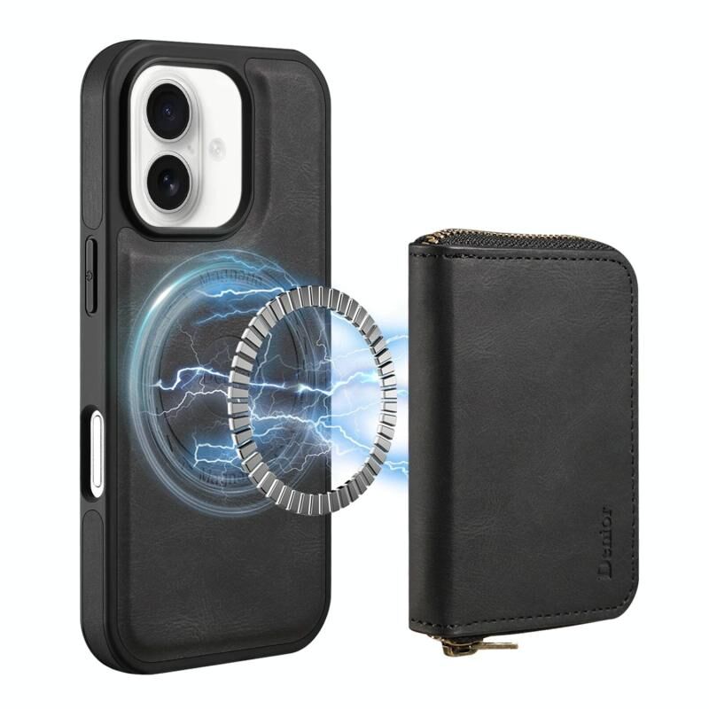 Θήκη τηλεφώνου δερμάτινη με μαγνητική σύνδεση MagSafe και φερμουάρ για iPhone 16 Plus, αίσθηση δέρματος Denior D26 (Μαύρο) (Μαύρο)