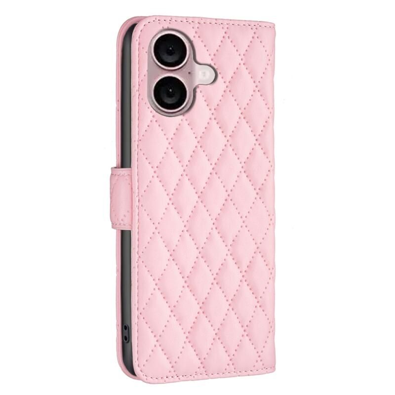 Θήκη τηλεφώνου τύπου πορτοφολιού με δερμάτινη επένδυση και σχέδιο διαμαντόπλεγματος για iPhone 16 Plus (Λευκό)