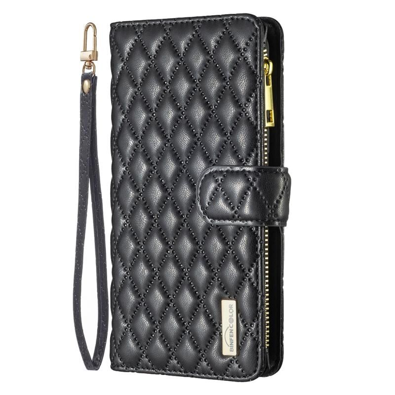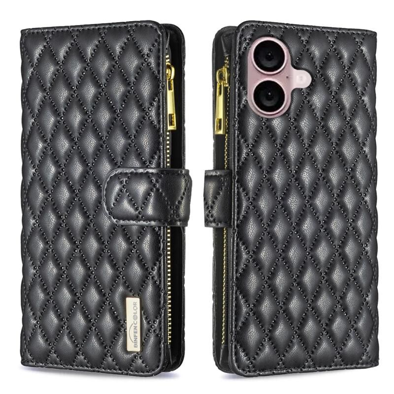 Θήκη τηλεφώνου τύπου flip από δέρμα με φερμουάρ και σχέδιο διαμαντόπλεγματος για iPhone 16 Plus (Μαύρο)