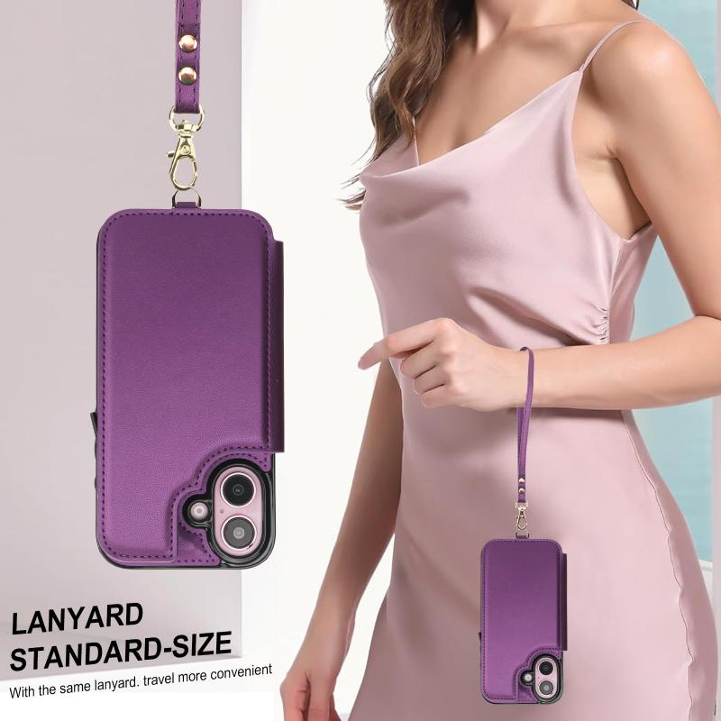 For iPhone 16 Plus Double Flap Zipper RFID Leather Phone Case with Short Lanyard(Dark Purple)