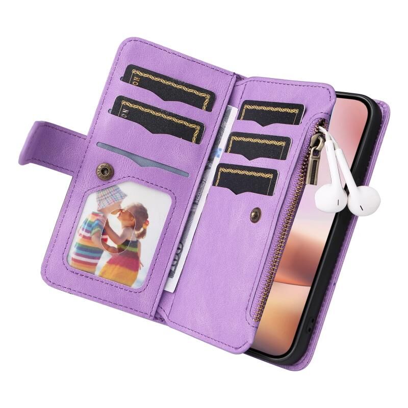 Θήκη τηλεφώνου δερμάτινη με φερμουάρ, διχρωμία, 9 θέσεις για κάρτες για iPhone 16 Plus (Μαύρο)