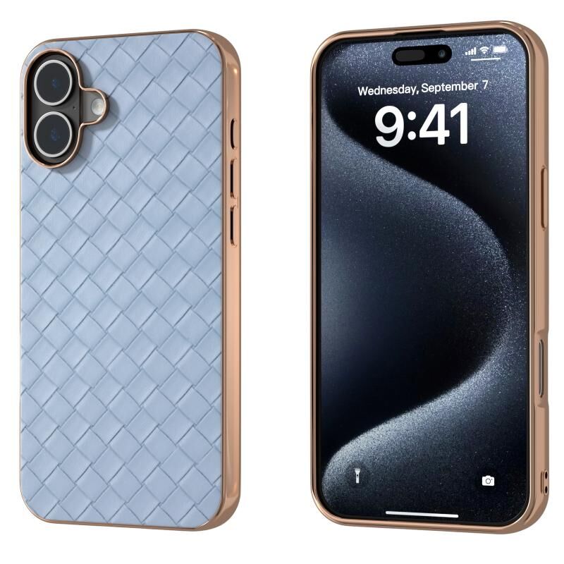 Θήκη τηλεφώνου από PU με υφαντή υφή και επιμεταλλωμένο πλαίσιο για iPhone 16 Plus (Ανοιχτό μπλε)