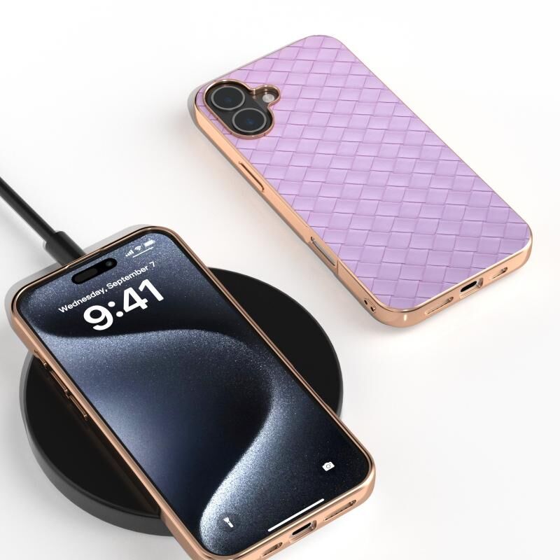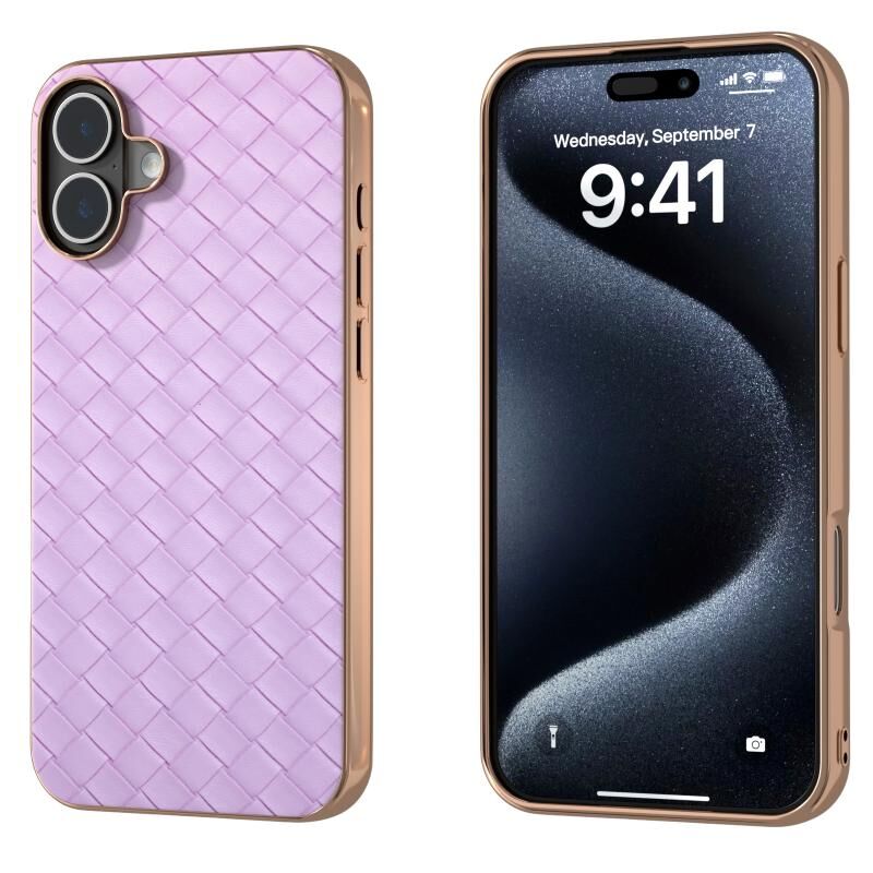 Θήκη τηλεφώνου από PU με υφαντή υφή και επιμεταλλωμένο πλαίσιο για iPhone 16 Plus (Μωβ)
