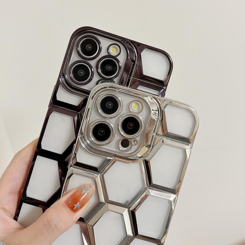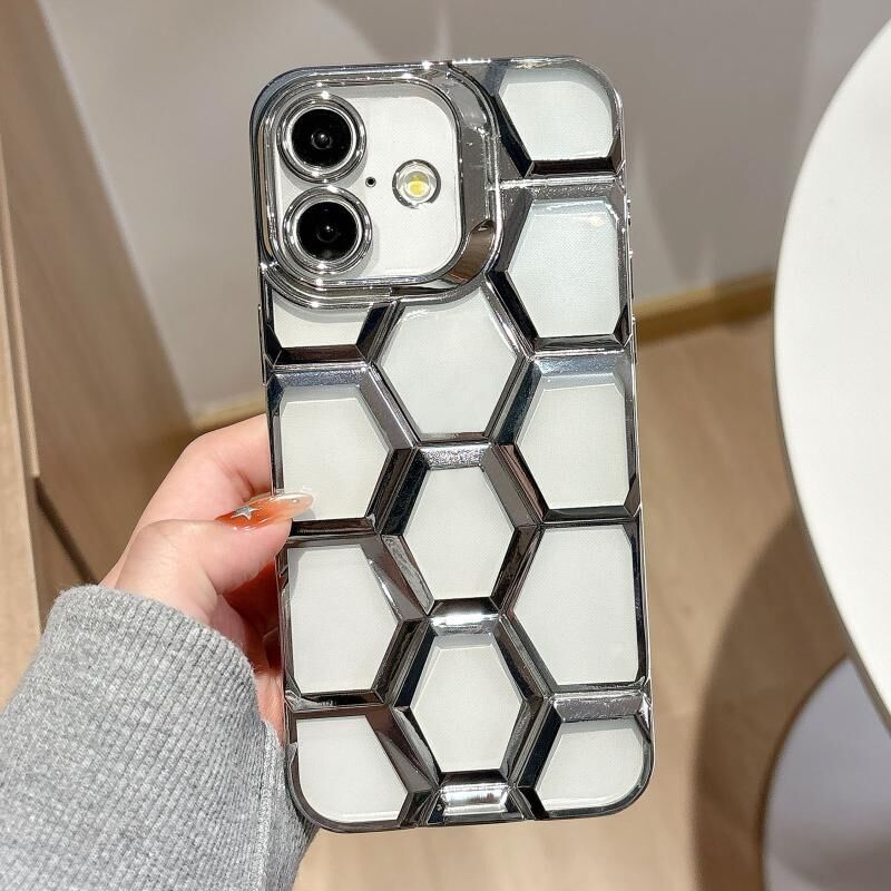 Θήκη τηλεφώνου για iPhone 16 Plus με ηλεκτρολυτική επίστρωση, χάραξη laser, 3D κυψελωτό σχέδιο, διαφανές TPU (Ασημί)