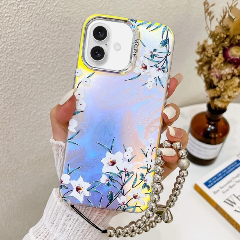 Θήκη τηλεφώνου με ηλεκτρολυτική επίστρωση και λουλούδια με λέιζερ για iPhone 16 Plus με λουρί καρπού (Πρωινό Γλωσσινί AH16)