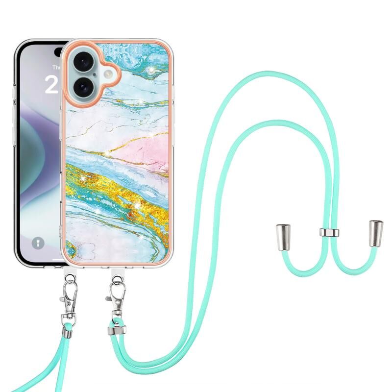 Θήκη τηλεφώνου με επιμετάλλωση, μαρμάρινη, διπλής όψης IMD για iPhone 16 Plus με κορδόνι (Μωβ 001)