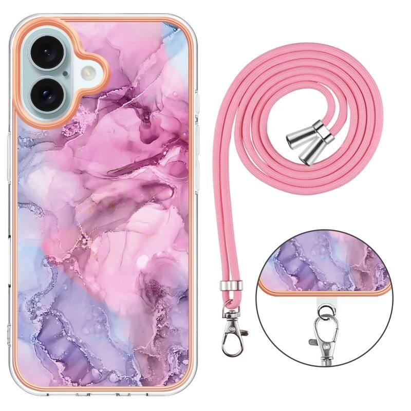 For iPhone 16 Plus Electroplating Marble Dual-side IMD Phone Case with Lanyard(Pink 013)