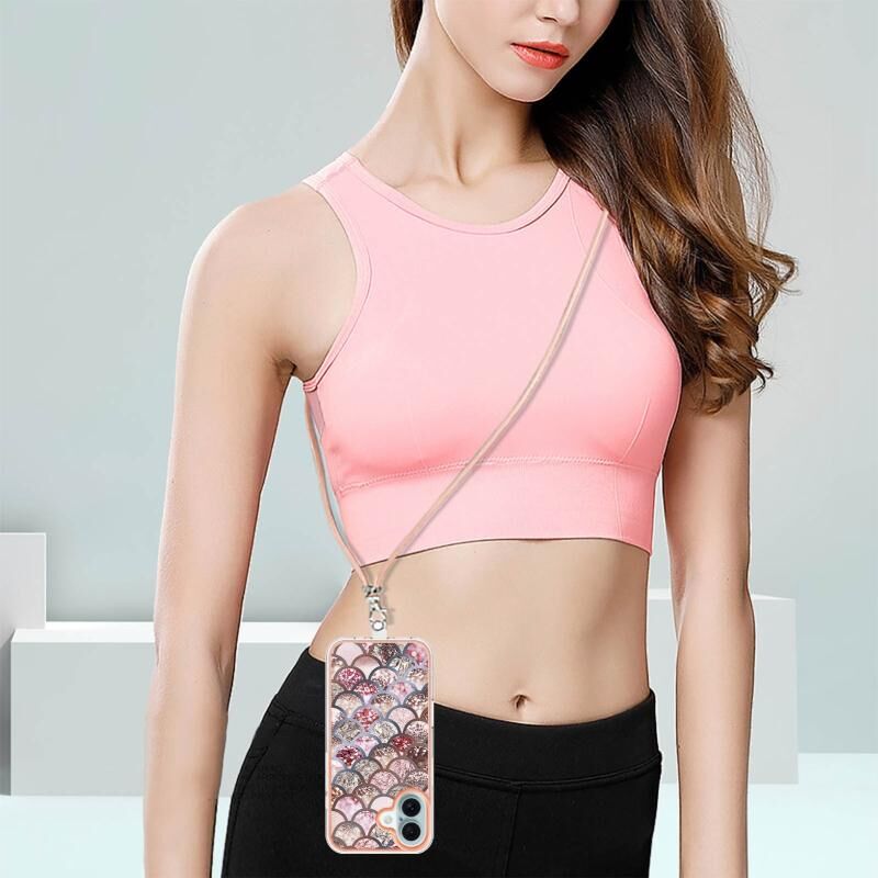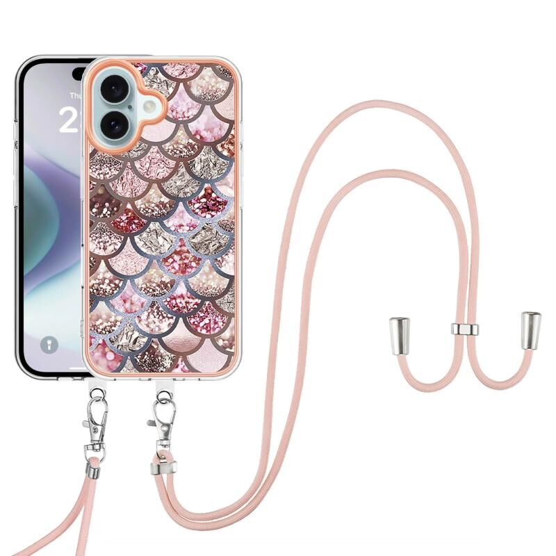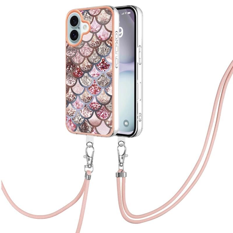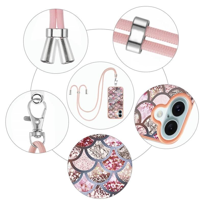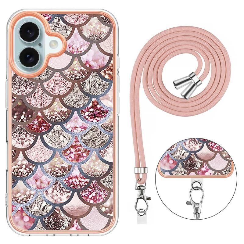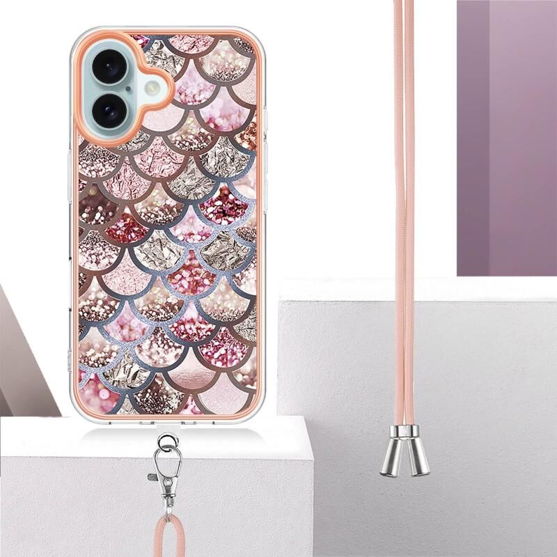 Θήκη για iPhone 16 Plus με σχέδιο επιμετάλλωσης IMD TPU αντικραδασμική με λουρί λαιμού (Ροζ Λέπια)