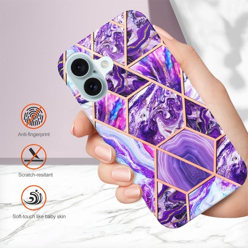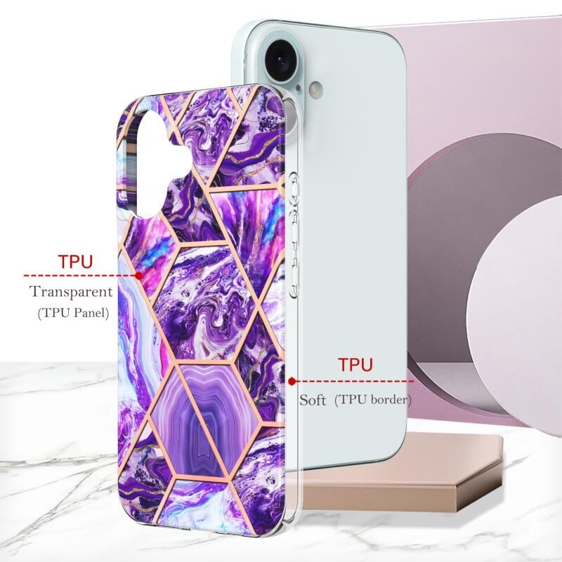 For iPhone 16 Plus Electroplating Splicing Marble Flower Pattern Dual-side IMD TPU Shockproof Phone Case(Dark Purple)
