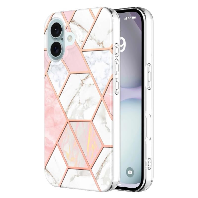 For iPhone 16 Plus Electroplating Splicing Marble Flower Pattern Dual-side IMD TPU Shockproof Phone Case(Pink White)