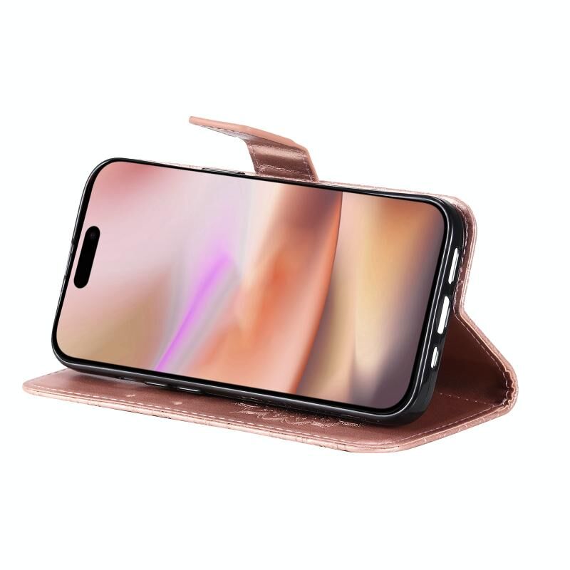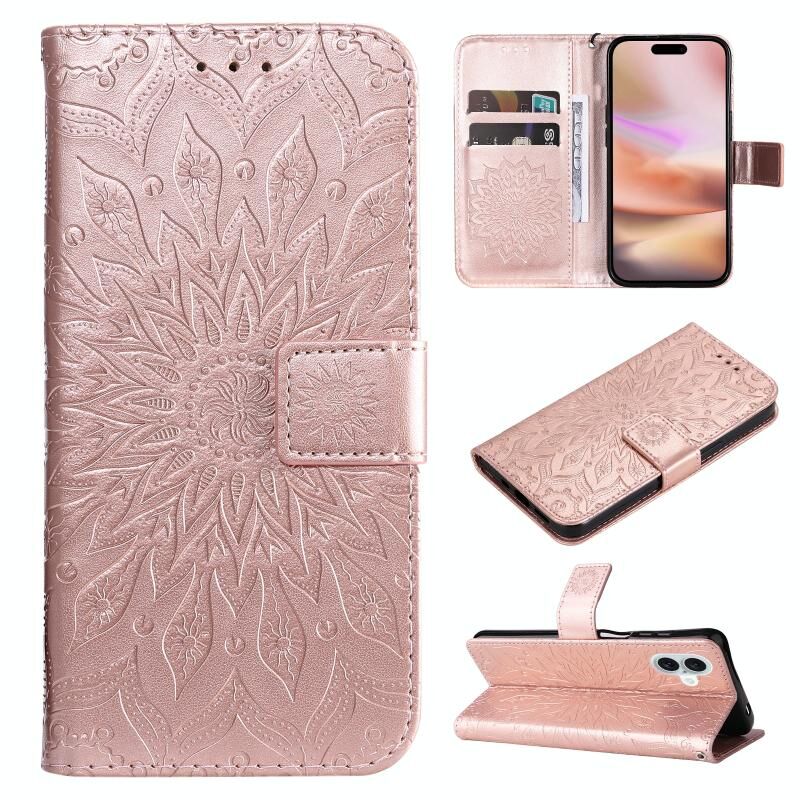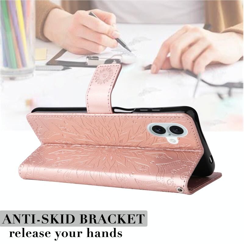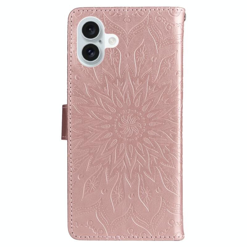 Θήκη τηλεφώνου από δέρμα με σχέδιο ανάγλυφου ηλίανθου για iPhone 16 Plus (Χρυσό ροζ)