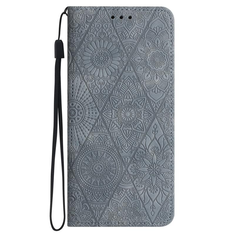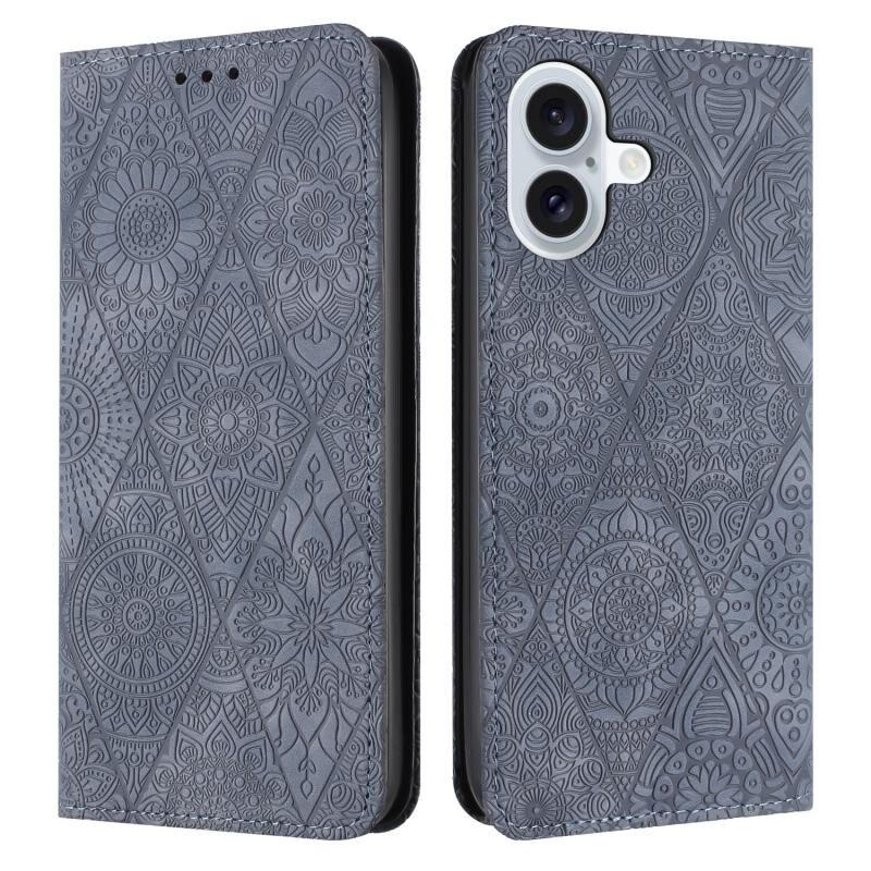 Θήκη τηλεφώνου από δέρμα με απορρόφηση και εθνοτικό ανάγλυφο για iPhone 16 Plus (Γκρι)