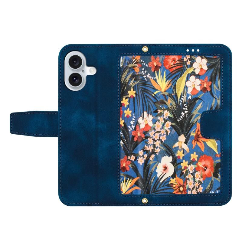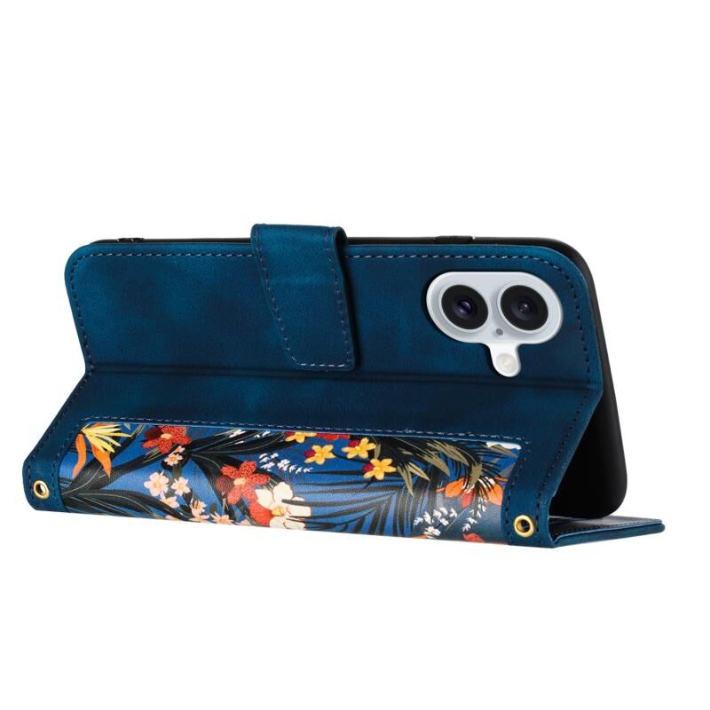 Θήκη τηλεφώνου από δέρμα με λουλουδάτο σχέδιο για iPhone 16 Plus με κορδόνι (Ανοιχτό Μωβ)