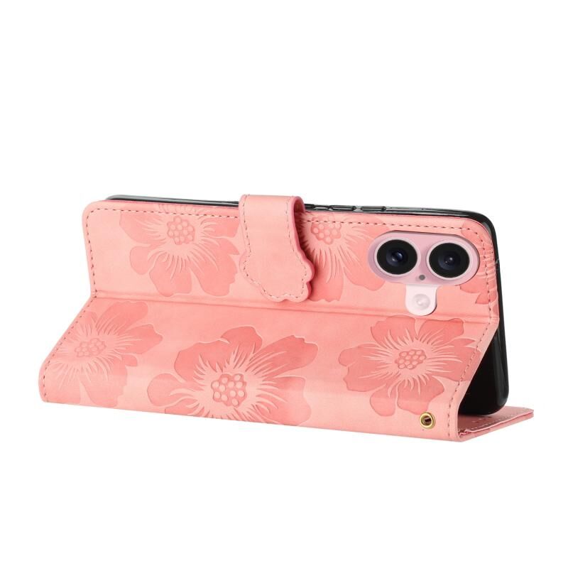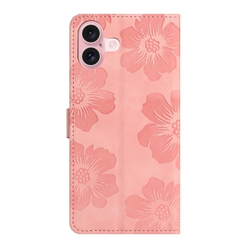 Θήκη τηλεφώνου δερμάτινη με ανάγλυφο σχέδιο λουλουδιών για iPhone 16 Plus (ρόζ)