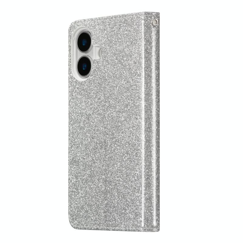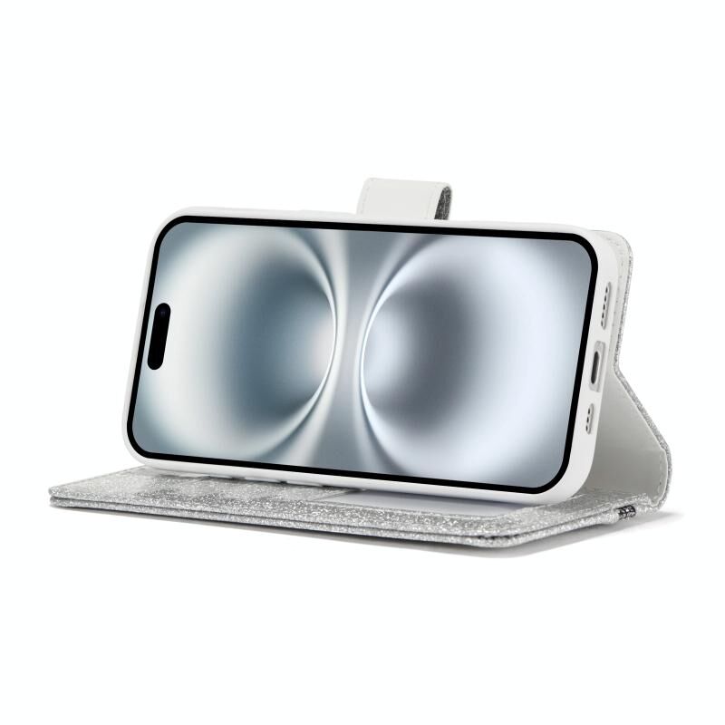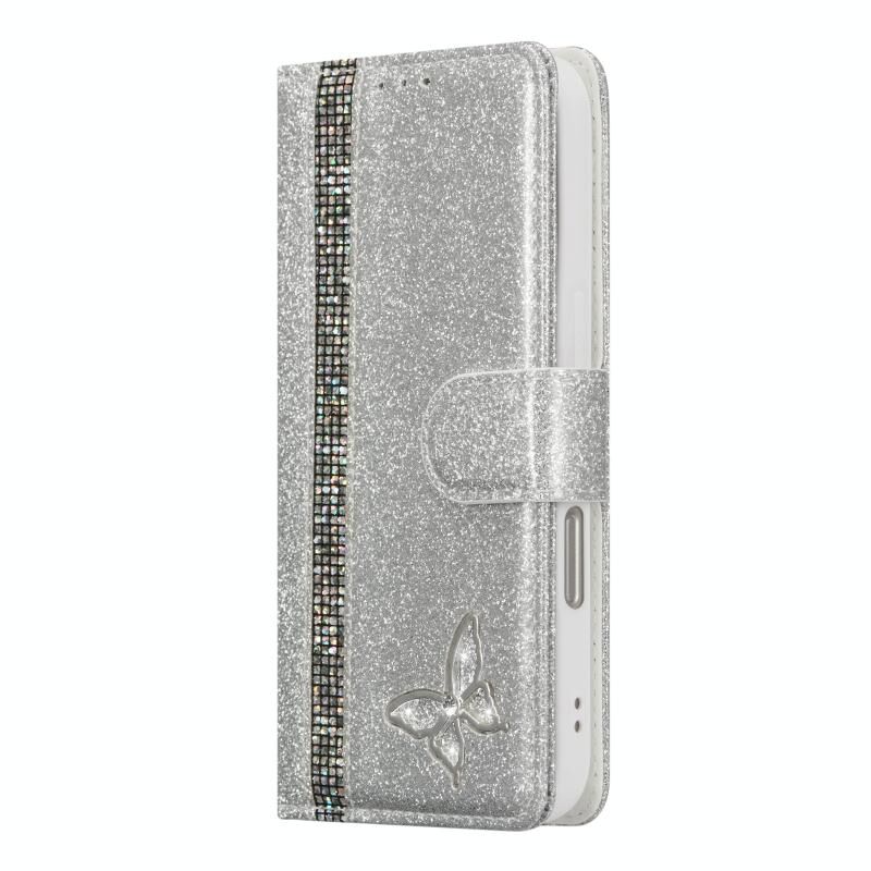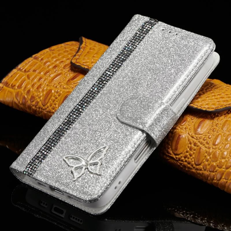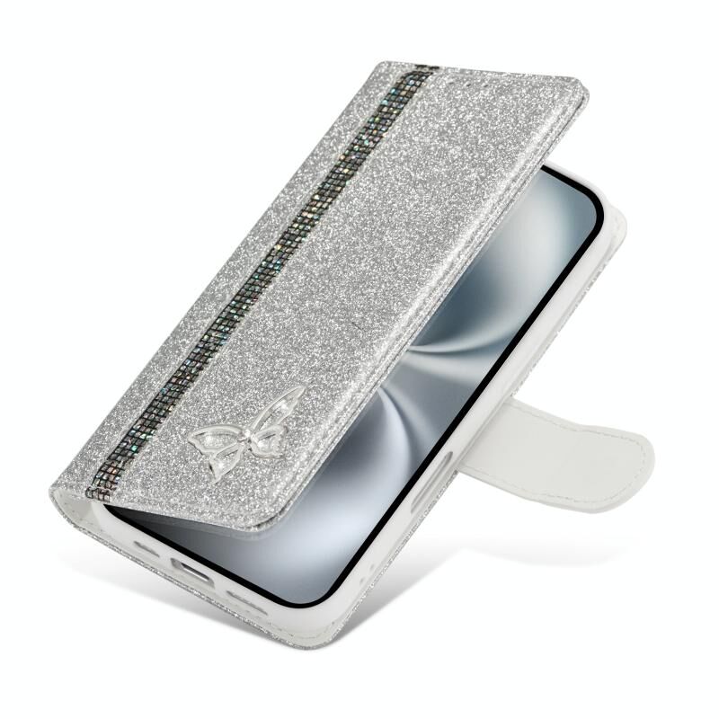 Θήκη τηλεφώνου από δέρμα με γκλίτερ και πεταλούδες για iPhone 16 Plus (Ασημί)