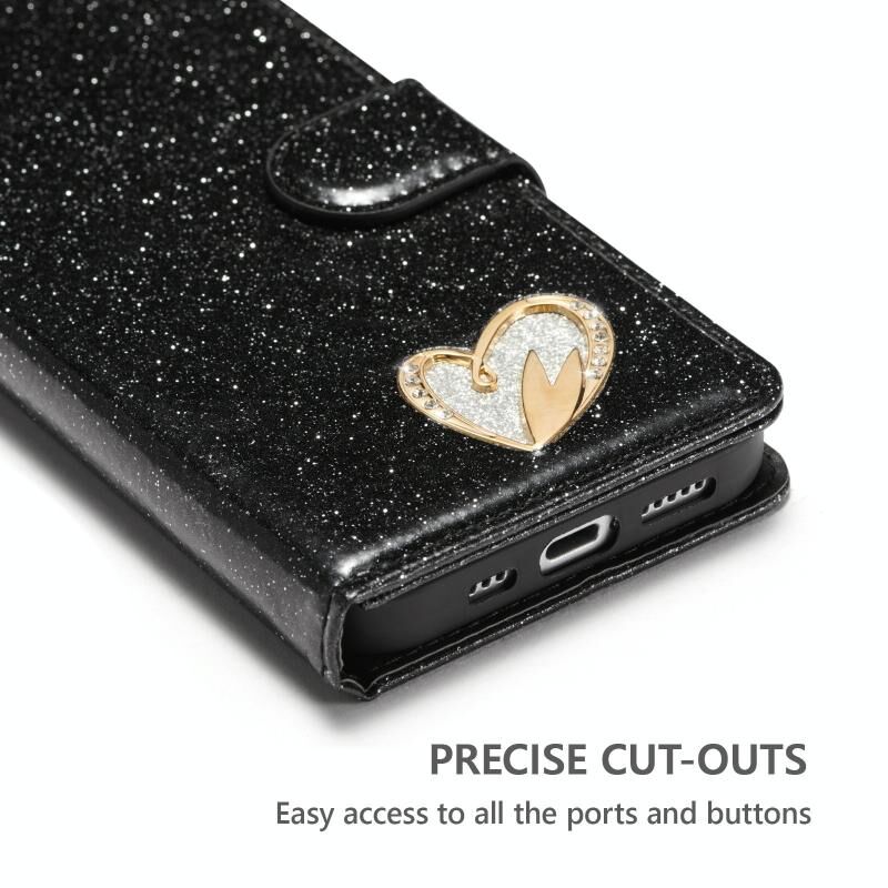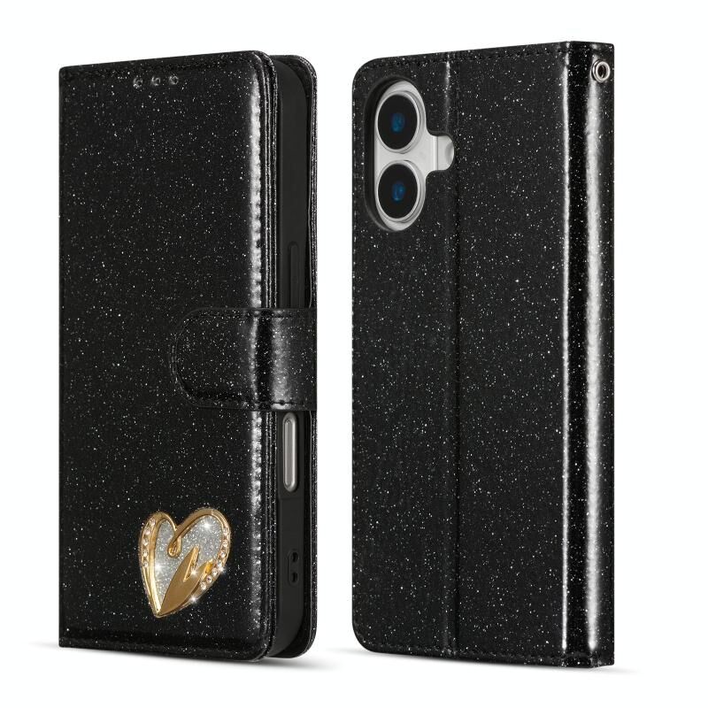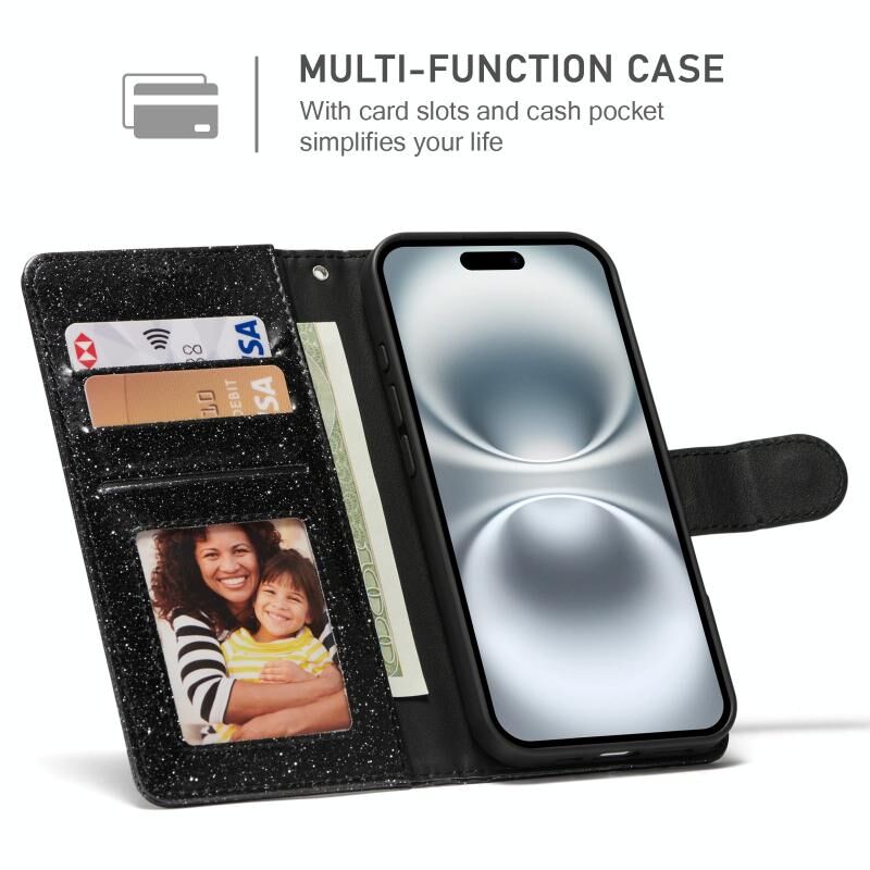 Θήκη τηλεφώνου για iPhone 16 Plus με γκλίτερ, σκόνη και δέρμα (Μαύρο)