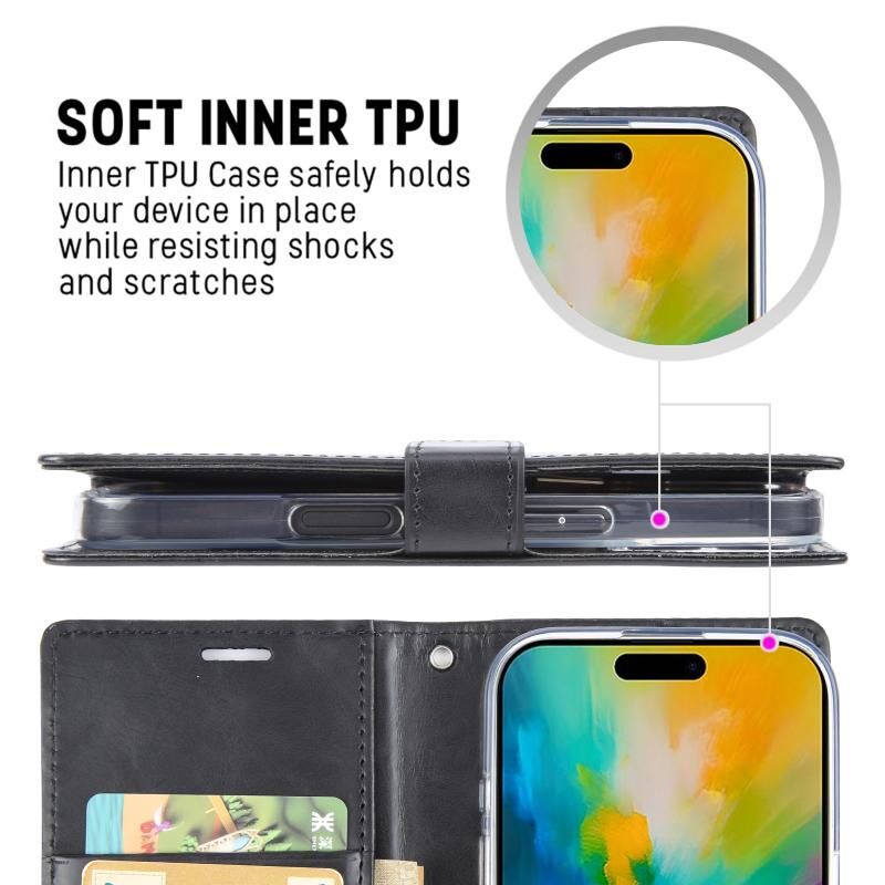 Θήκη τηλεφώνου GOOSPERY BLUE MOON από δέρμα Crazy Horse με υφή για iPhone 16 Plus (Μαύρο) (Χρυσός)