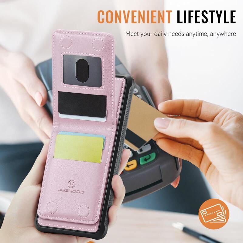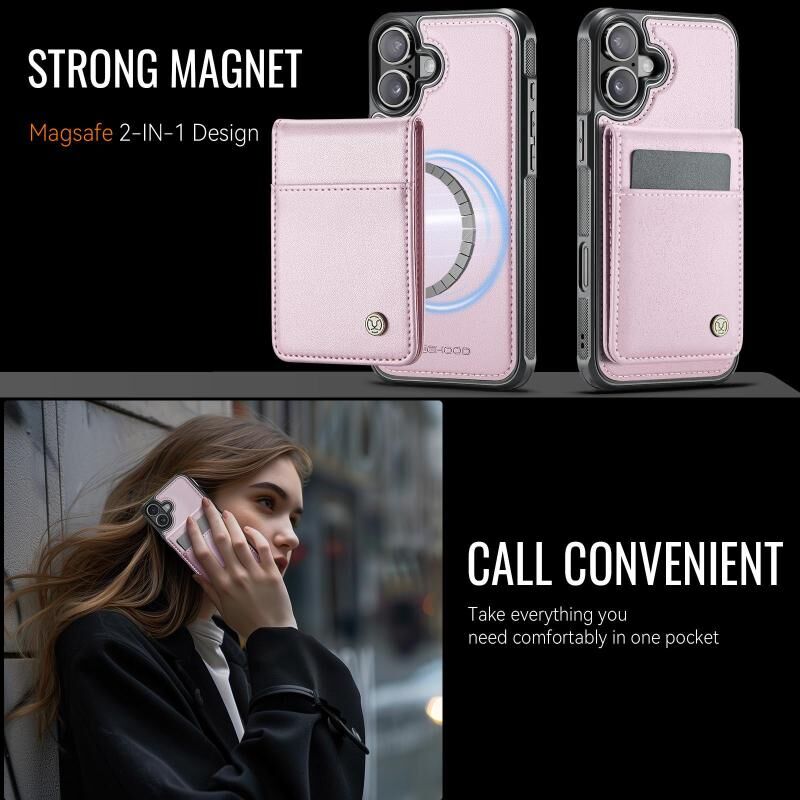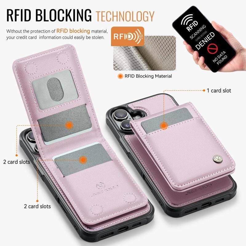 Για iPhone 16 Plus JEEHOOD J06 Βρετανικού Στυλ Θήκη Κάρτας RFID MagSafe από Δερματίνη (Καφέ) (ρόζ)