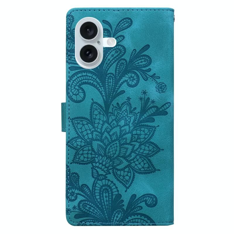 Θήκη τηλεφώνου για iPhone 16 Plus με δαντελένιο λουλουδάτο ανάγλυφο, μαγνητικό κούμπωμα και λουρί καρπού (Πράσινο)