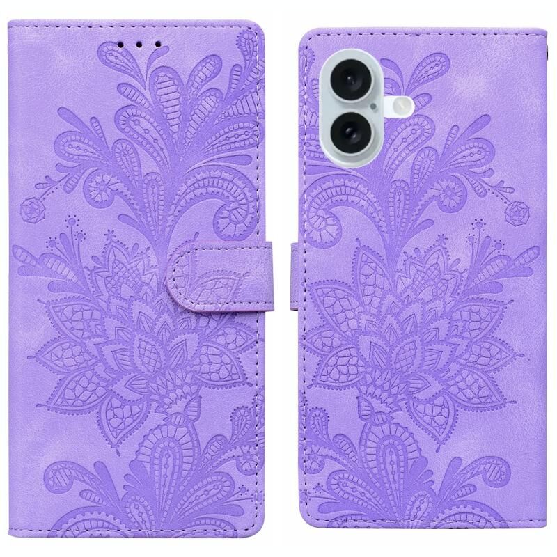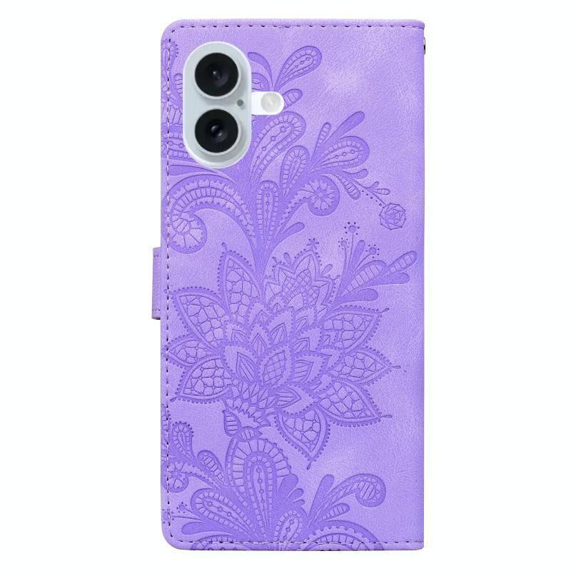 Θήκη τηλεφώνου για iPhone 16 Plus με δαντελένιο λουλουδάτο ανάγλυφο, μαγνητικό κούμπωμα και λουρί καρπού (Πράσινο)
