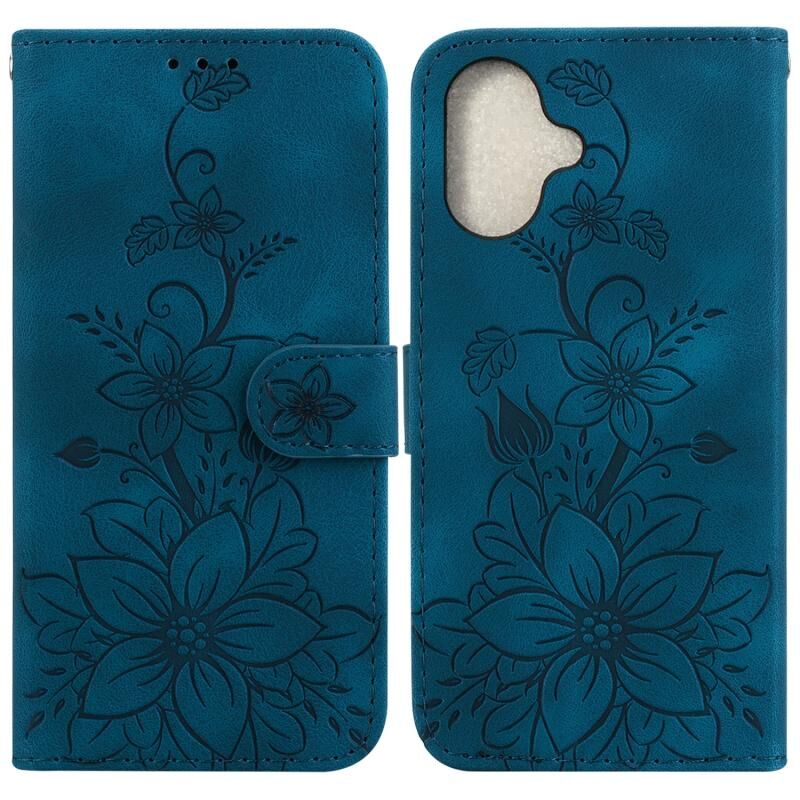 For iPhone 16 Plus Lily Embossed Leather Phone Case(Dark Blue)