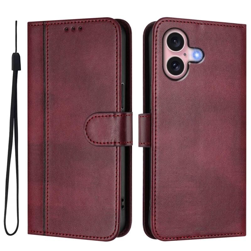 For iPhone 16 Plus Line Splicing Buckle Retro Leather Phone Case(Wine Red)