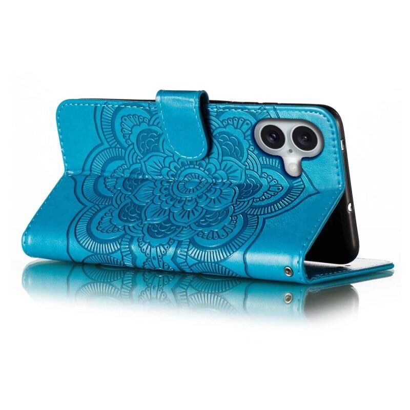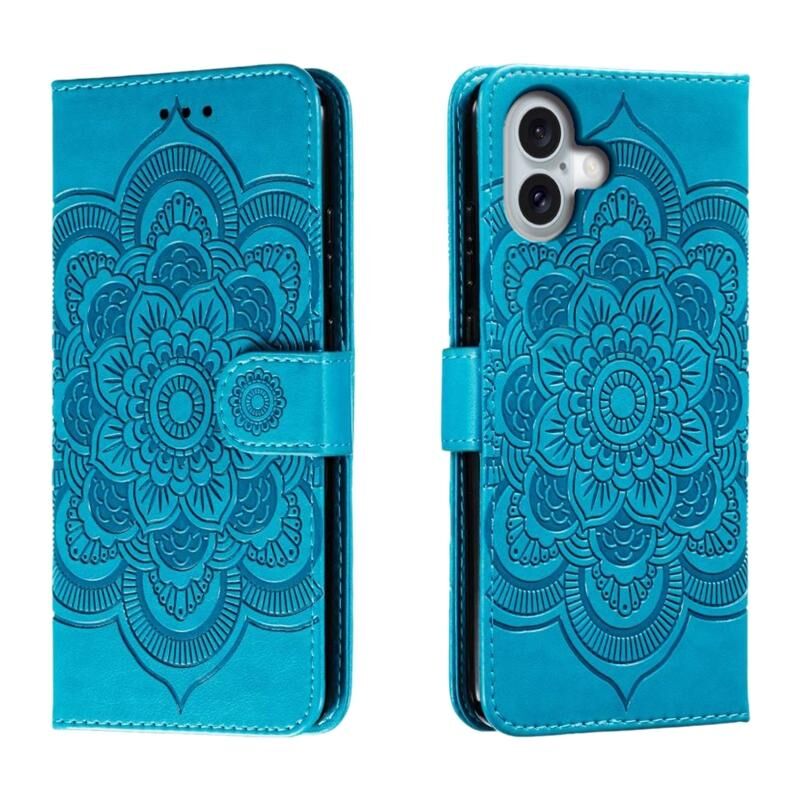Θήκη τηλεφώνου από δέρμα με οριζόντιο άνοιγμα και ανάγλυφο σχέδιο Mandala για iPhone 16 Plus (Μπλε)