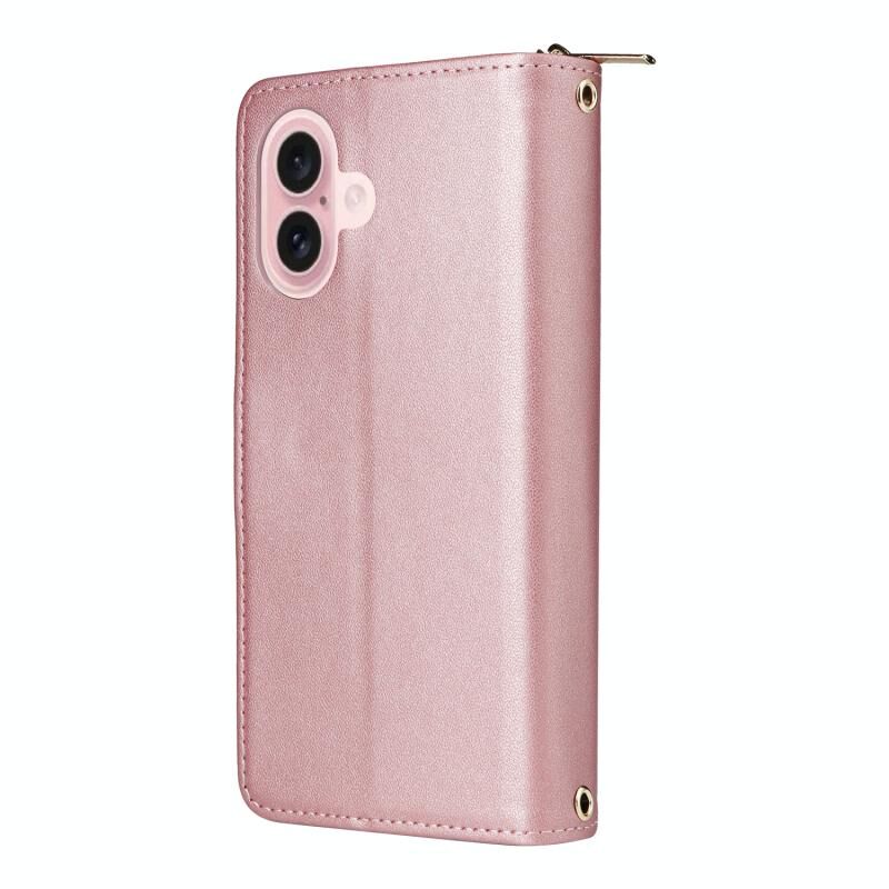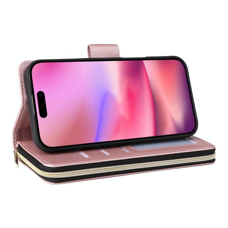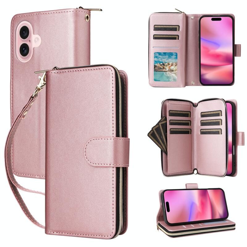 Θήκη τηλεφώνου από δέρμα με θήκη πορτοφολιού με φερμουάρ και εννέα θέσεις για κάρτες για iPhone 16 Plus (Κρασί)