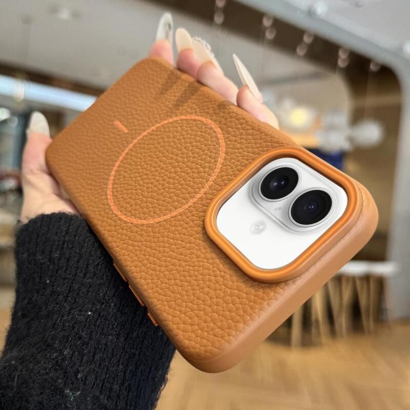 Θήκη τηλεφώνου για iPhone 16 Plus, Πορτοκαλί Δακτύλιος MagSafe, Δέρμα Λίτσι TPU (Μαύρο)