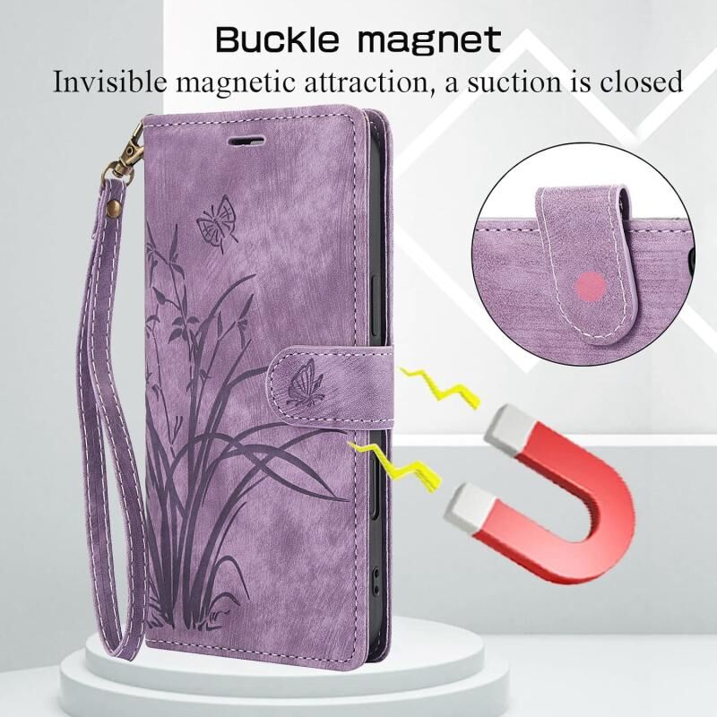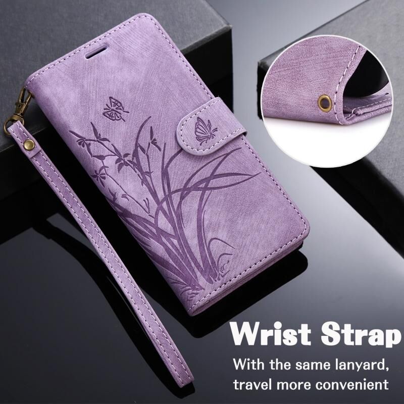 Θήκη τηλεφώνου από δέρμα με ανάγλυφο σχέδιο ορχιδέας και πεταλούδας για iPhone 16 Plus (Μωβ)